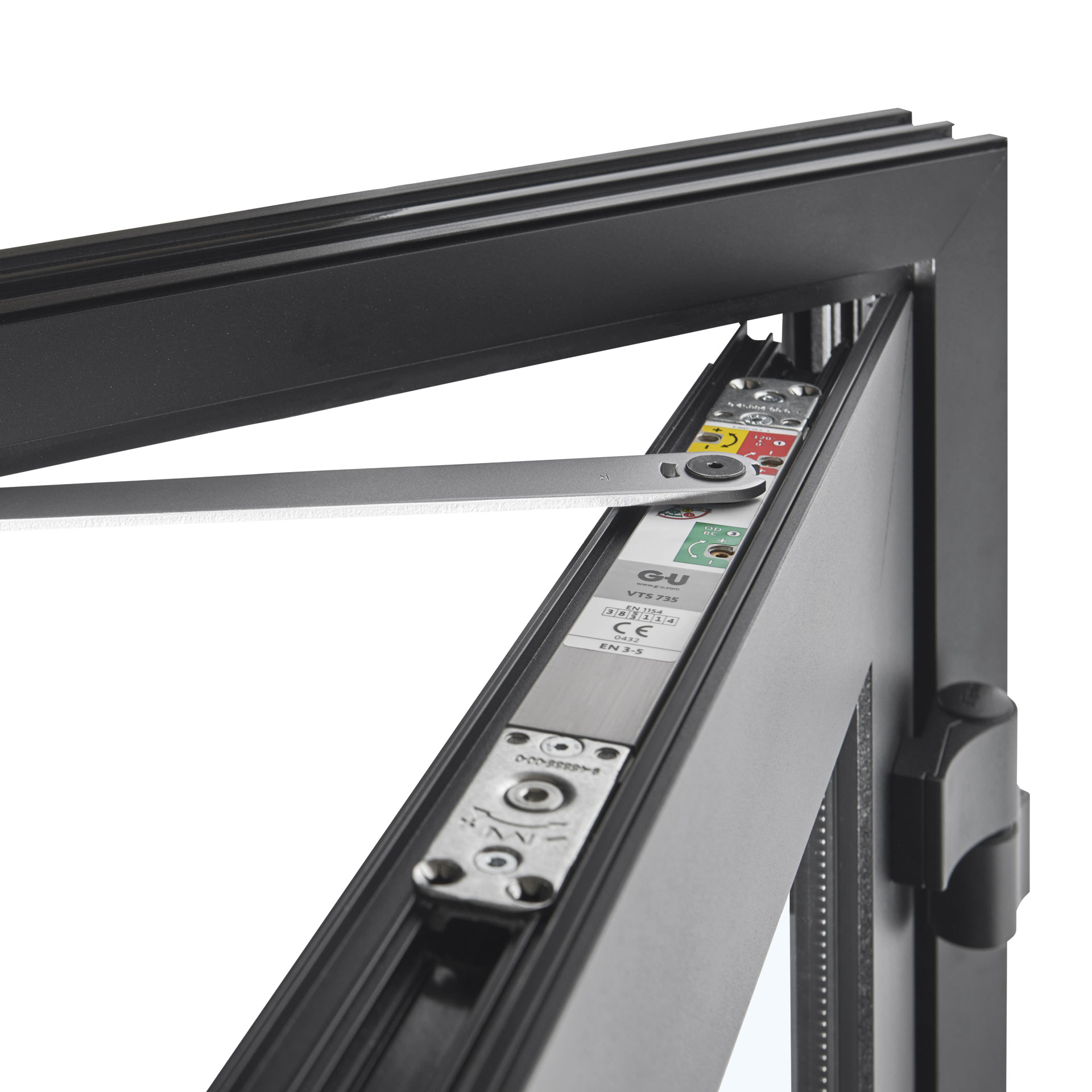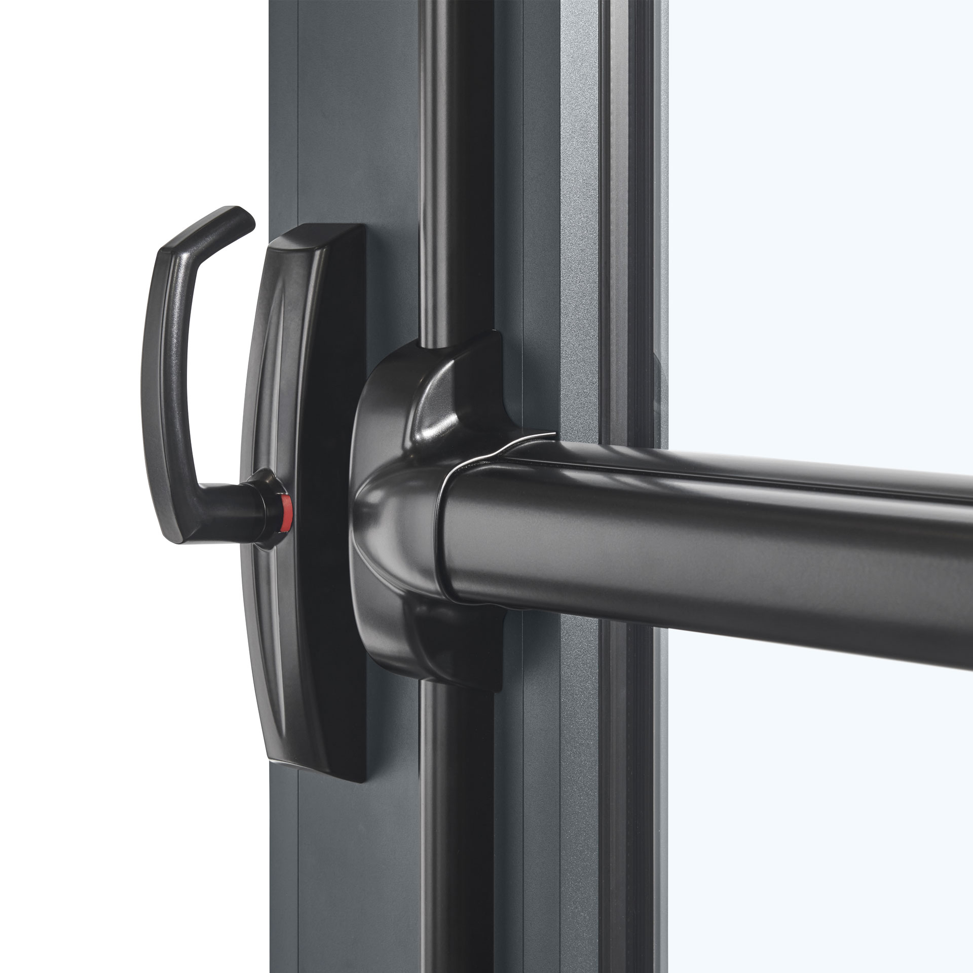 - Crémone pompier sur vantail secondaire (poignée tournante / tringlerie invisible)