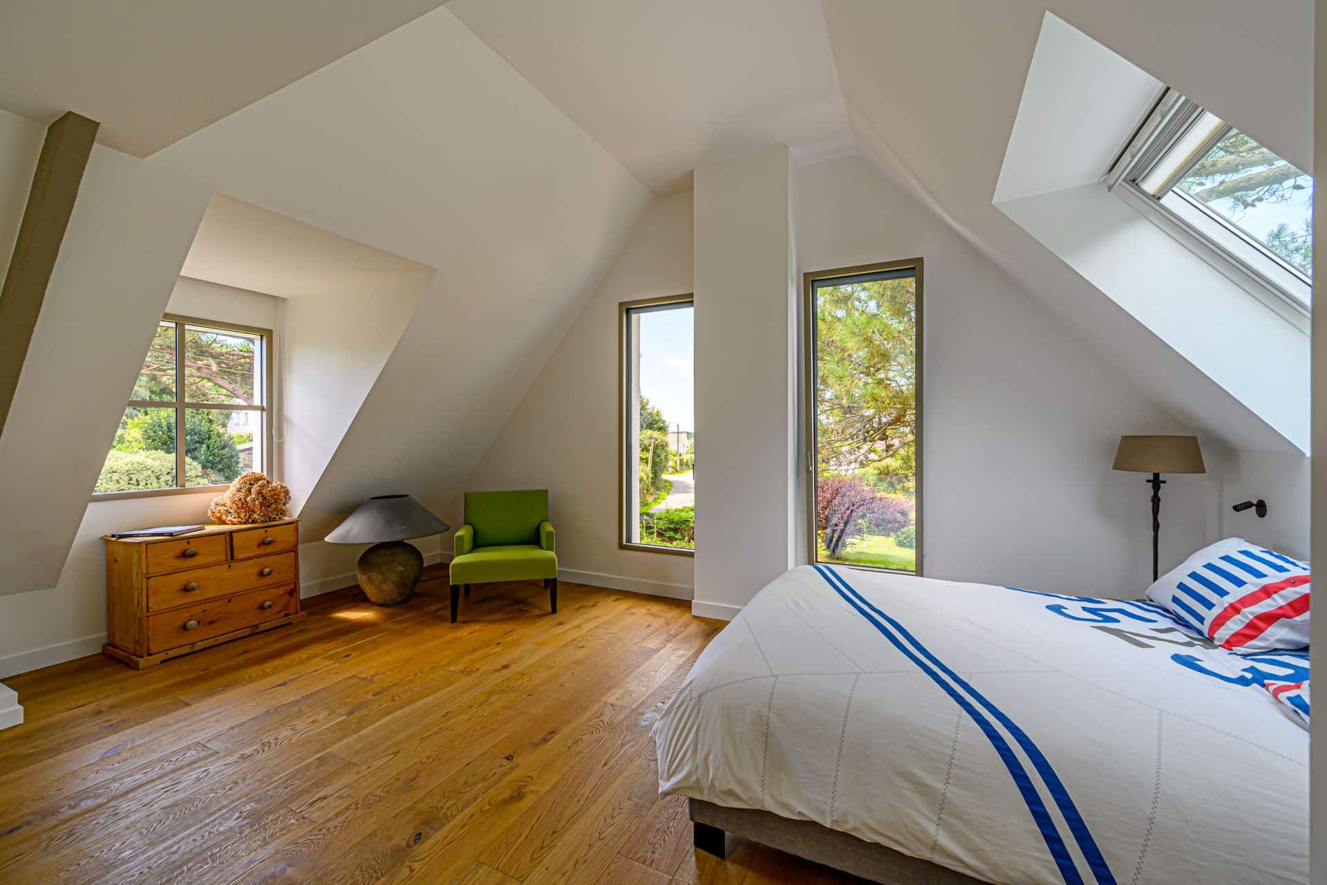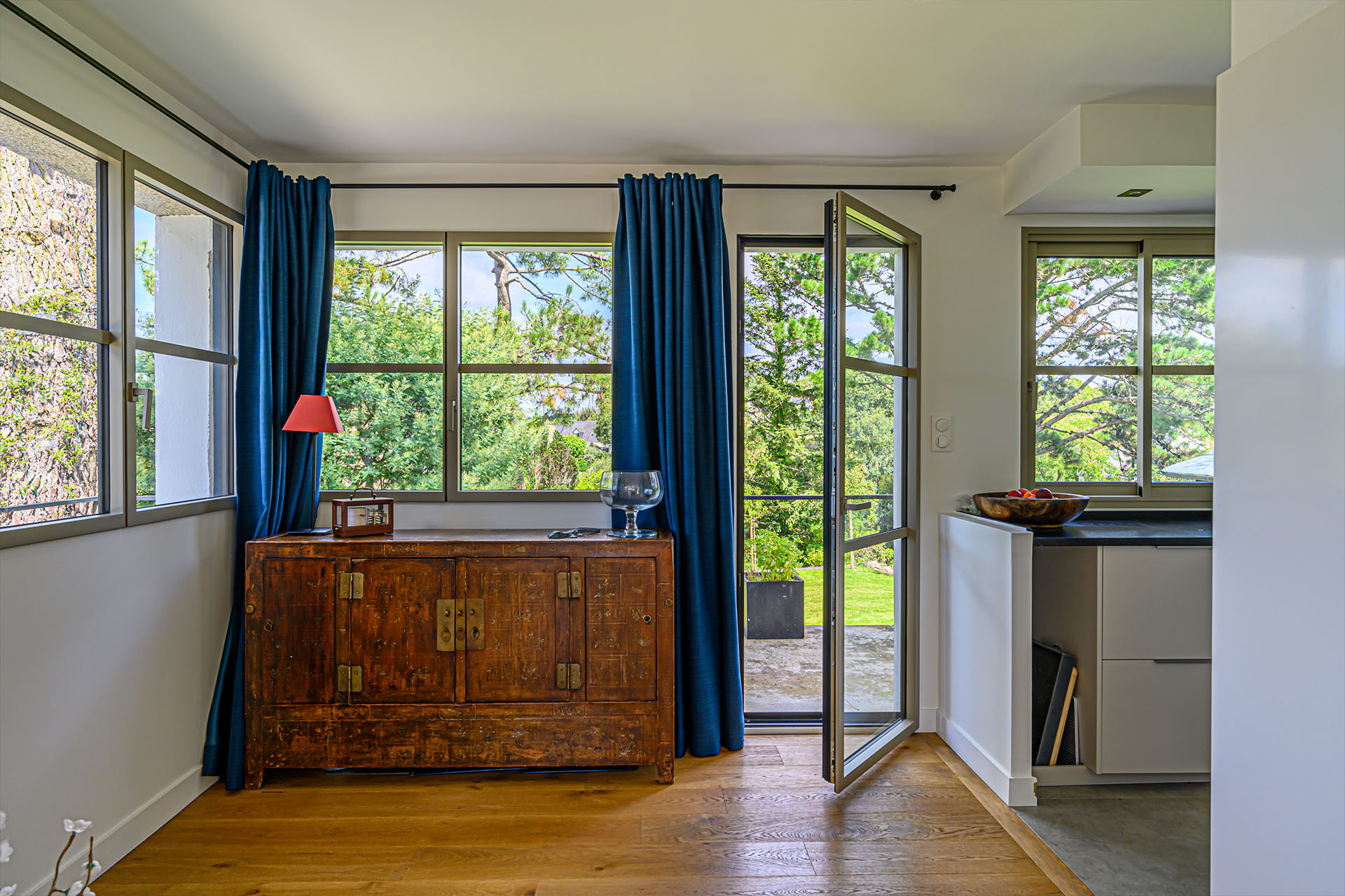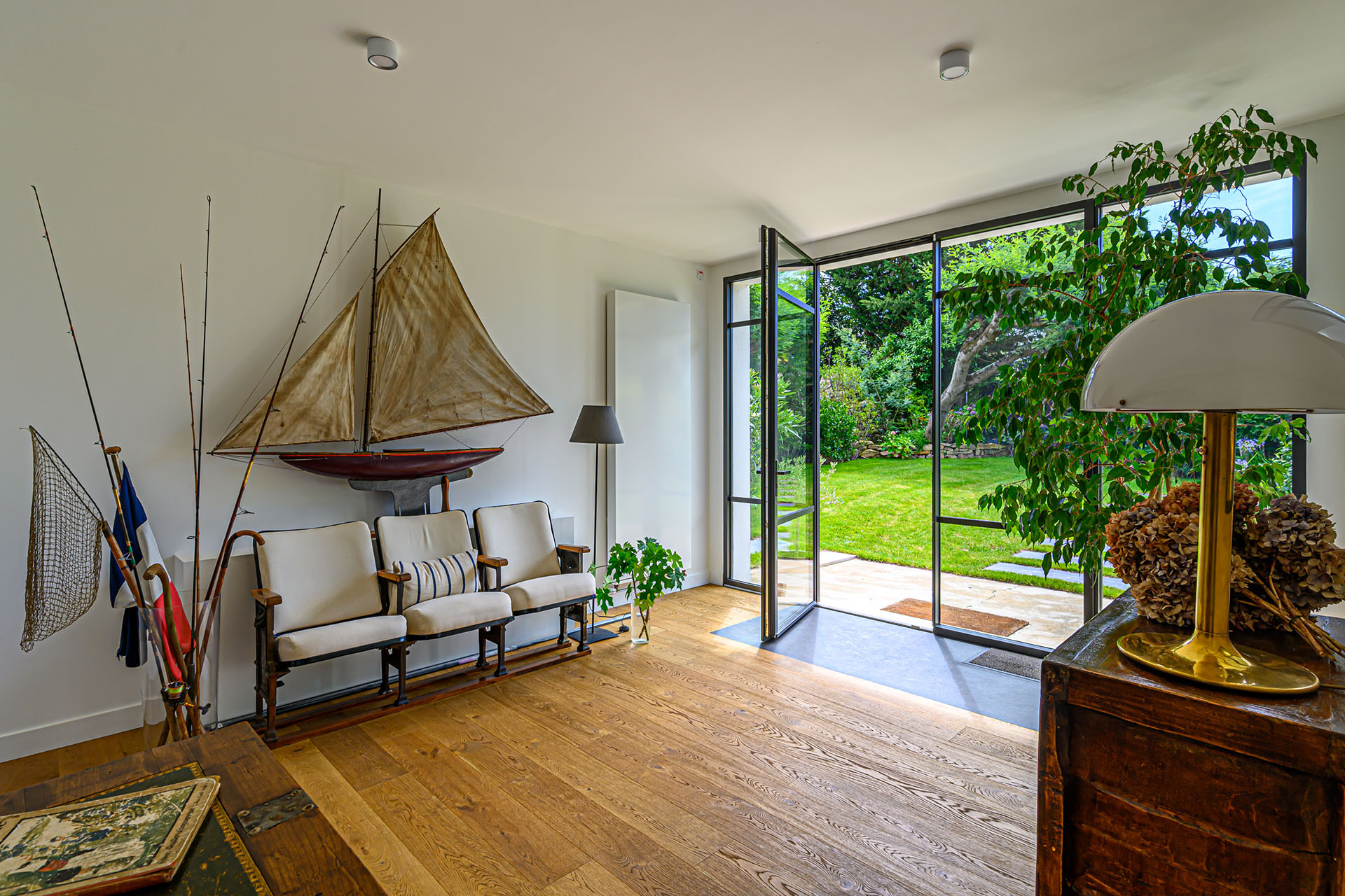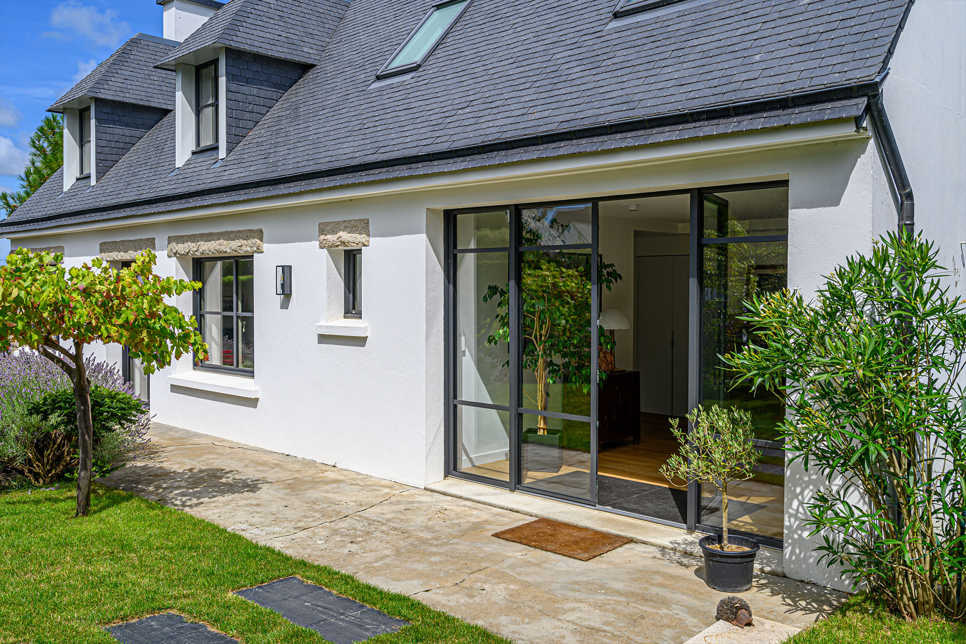 Cette maison morbihannaise propose un subtil mélange entre style breton et design contemporain grâce à une rénovation proposant des menuiseries design et fines permettant d’apporter un maximum de lumière.