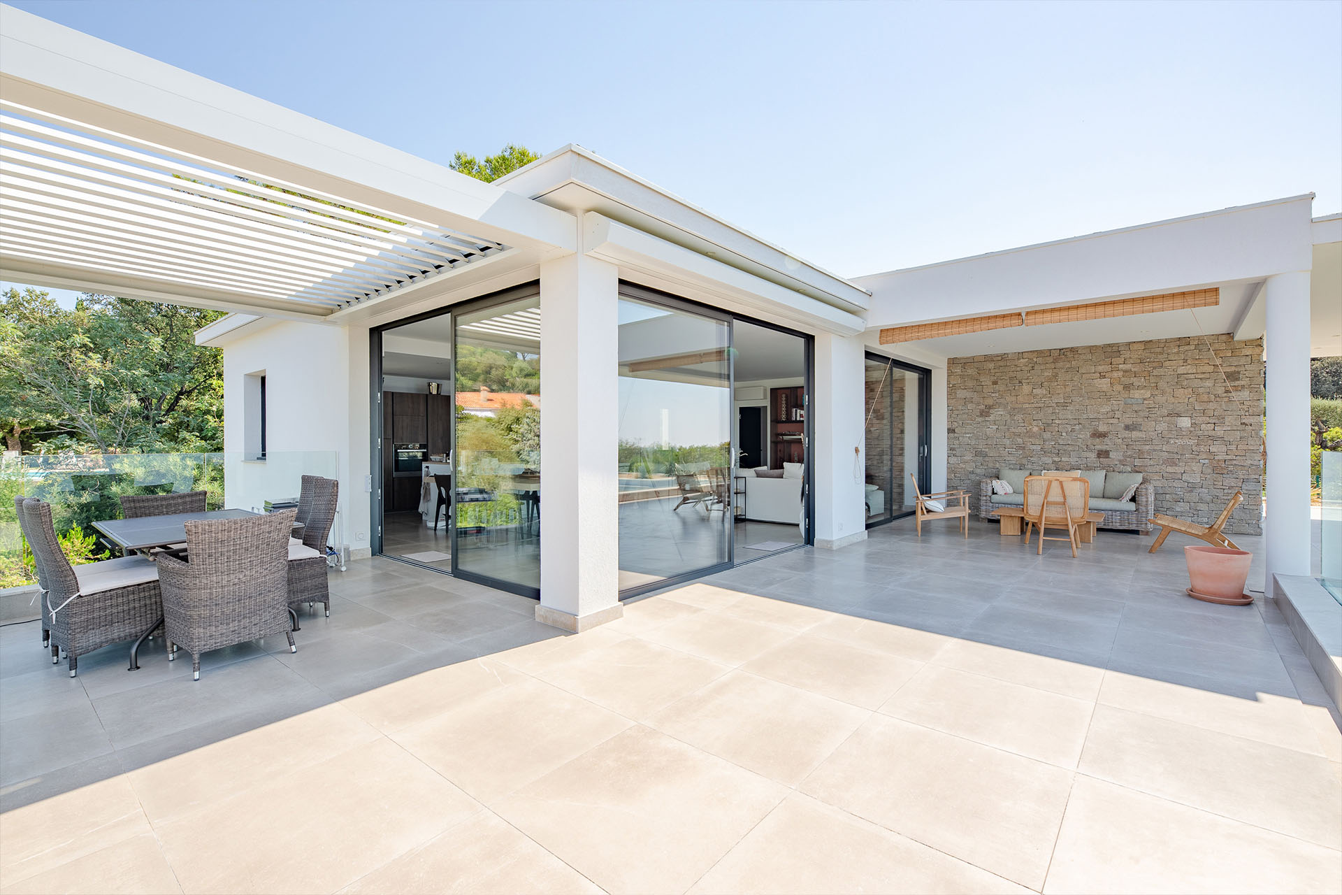 Une maison ouverte sur l'extérieur avec la Méditerranée pour toile de fond.
